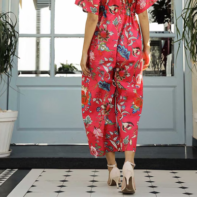 "Printed basic jumpsuit ,has a v-neck, short sleeves, 2 pockets