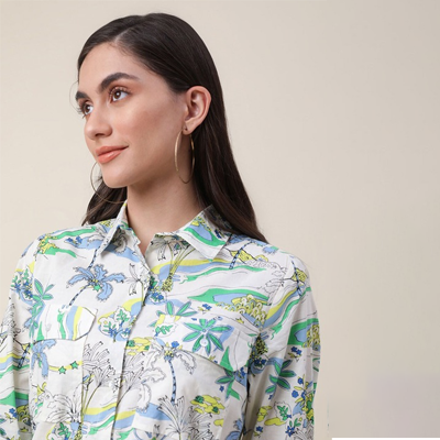"Printed tunic ,has a shirt collar, long sleeves, button closure