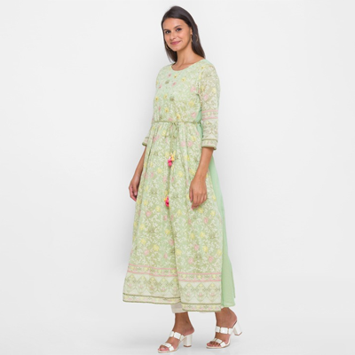 Kurti with Salwar Kurti design: Floral printed A-line shape Panelled style Keyhole neck, sleeveless roll-up sleeves Na pockets Calf length with flared hem Polyester machine weave fabric Salwar design: Embroidered Salwar Elasticated waistband Hook and eye closure Size & Fit The model (height 5'8) is wearing a size S Material & Care Cold Machine Wash, Wash & Iron Inside out, Do not Tumble Dry, Dry in Shade, Do not iron on print, Do not use Dryer, Wash Separetely
