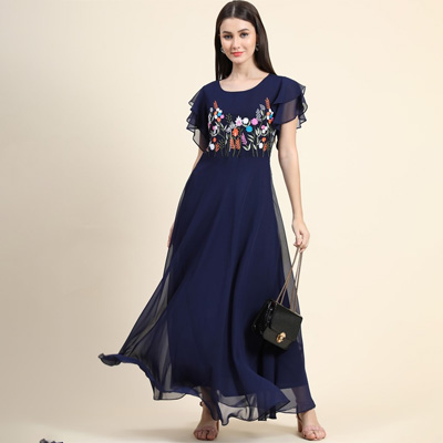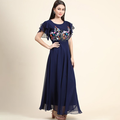 "Navy Blue embroidered maxi gown dress, has a round neck, short sleeves, and flared hem