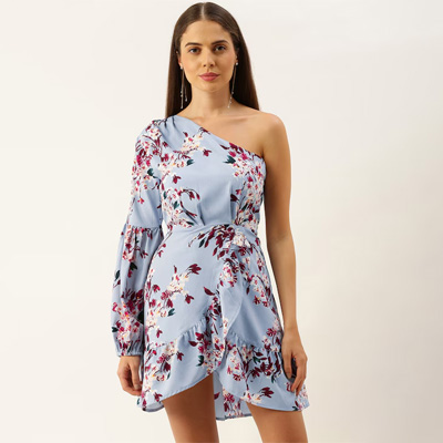 Women Blue Floral Printed One Shoulder Fit and Flare Dress