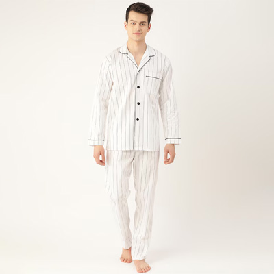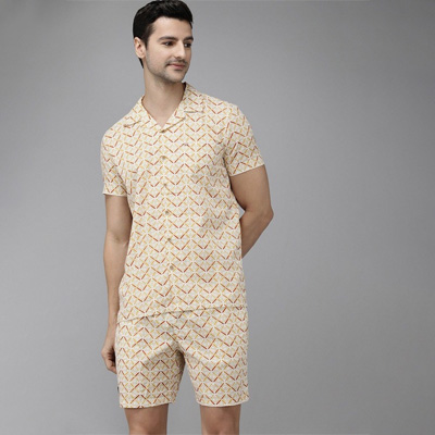 Men White & Orange Geometric Printed Pure Cotton Night suit