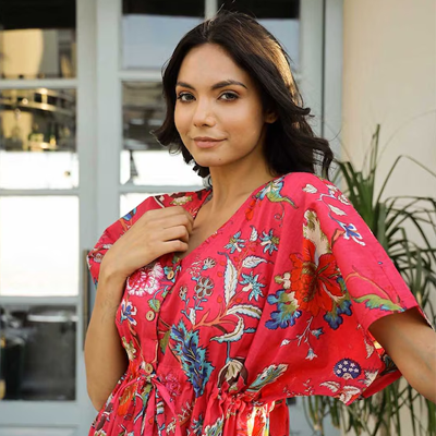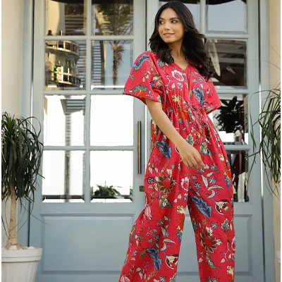 "Printed basic jumpsuit ,has a v-neck, short sleeves, 2 pockets
