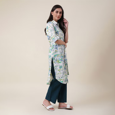 "Printed tunic ,has a shirt collar, long sleeves, button closure