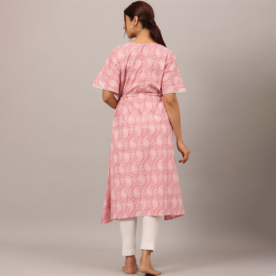 "Colour: pink Paisley printed V-neck Short, flared sleeves Anarkali shape with empire style Knee length with flared hem Machine weave regular cotton Size & Fit The model (height 5'8) is wearing a size S Material & Care 100% Cotton Machine Wash"