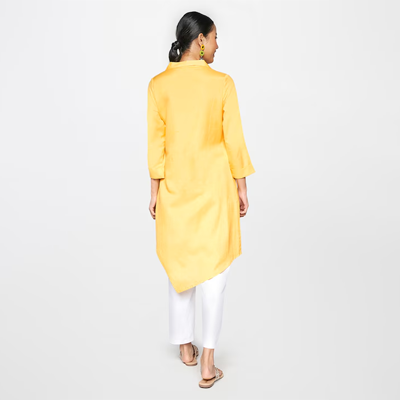 "Yellow solid tunic ,has a shirt collar, three-quarter sleeves, and asymmetric hem Size & Fit The model (height 5'8) is wearing a size S Material & Care 55% viscose 35% cotton 10% flex Machine wash"